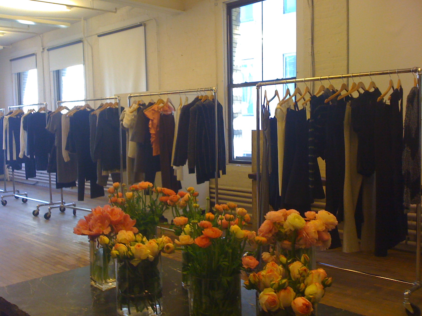 Zspoke is the diffusion line for Zac Posen his collection was perfect for the modern woman looking to pull back on spending big bucks but wanting more from her clothes. Everything from the bags to the jackets and evening gowns are more than desirable. The showroom smelled of peonies which added color the the long wooden tables that they sat upon. Ben who showed us the collection was super accomidating answer Jai's questions and my few questions like "Which bag was Zac's favorite?". On our way out we ran into Zac who was running back into his studio with a rouge piece of champagne colored satin.